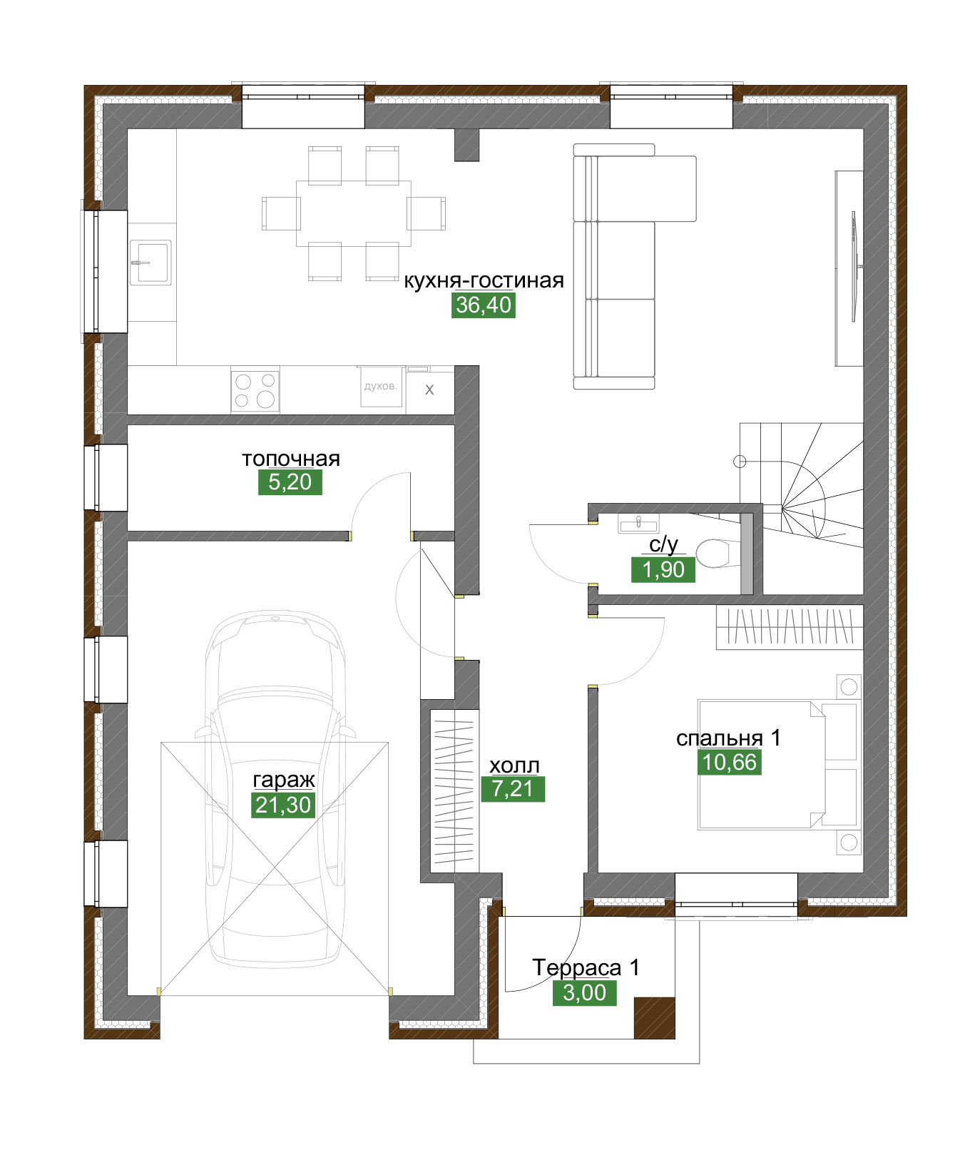 Проект дома "Лидер 15" — это двухэтажное комфортабельное жилье, созданное для современной загородной жизни. На первом этаже вас встретит просторная кухня-гостиная — сердце дома, где удобно готовить, собираться всей семьей и принимать гостей. Здесь же расположена уютная спальня, практичный санузел и топочная, а отдельный гараж защитит ваш автомобиль от непогоды.