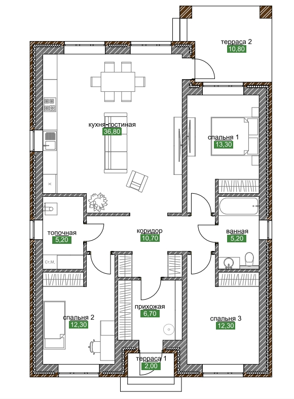 Функциональность планировки дополняется просторной прихожей и удобным коридором, а топочная изолирована от жилых помещений. Второй выход на небольшую террасу подчёркивает практичность и комфорт проживания.