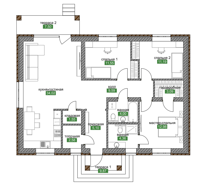 Одноэтажный дом с продуманной планировкой, идеально подходящий для семьи из 4–6 человек. Просторная кухня-гостиная объединяет зону отдыха и обеденную, создавая центральное пространство для семейного общения и приема гостей.
