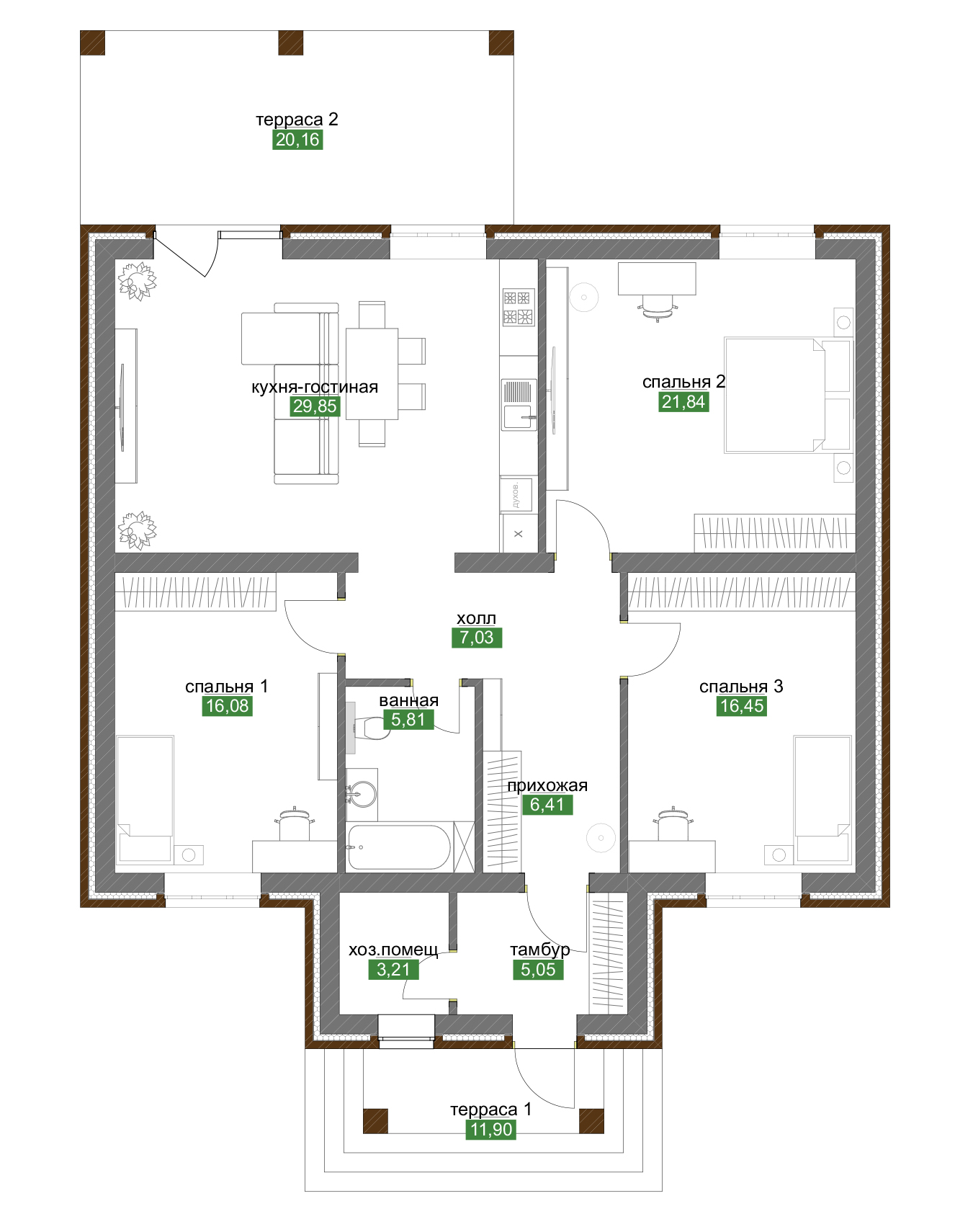 Три спальни различной площади обеспечивают комфортное размещение всех членов семьи. Две основные спальни большой площади подходят для родителей и подростков, третья может использоваться как детская комната или домашний кабинет в зависимости от потребностей. В доме предусмотрена удобная ванная комната с современной планировкой и функциональная прихожая с местом для верхней одежды. Просторный холл обеспечивает комфортное перемещение между всеми помещениями дома. Хозяйственное помещение решает вопросы хранения инвентаря, инструментов и сезонных вещей. Тамбур создает дополнительную буферную зону между улицей и жилыми помещениями, что особенно важно в холодное время года.