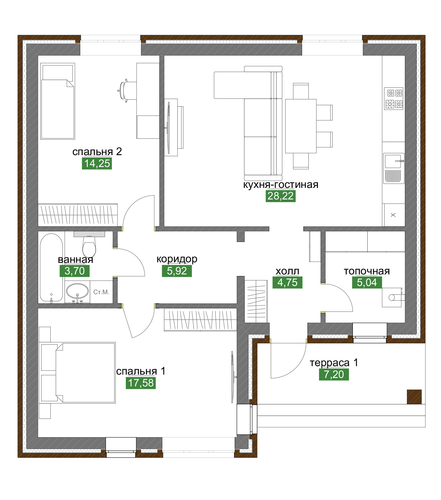 Практичные решения: Просторная терраса 7,20 м² расширяет жилое пространство в теплое время года. Топочная комната 5,04 м² обеспечивает автономное отопление дома.