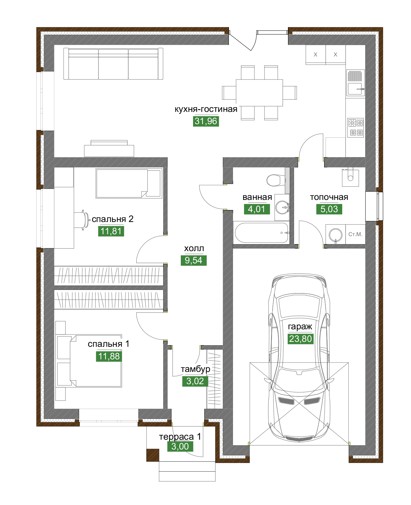 Откройте для себя современный комфорт в одноэтажном доме, где каждая деталь продумана для вашего удобства. Встроенный гараж и просторные жилые зоны делают этот проект мечтой каждой семьи.