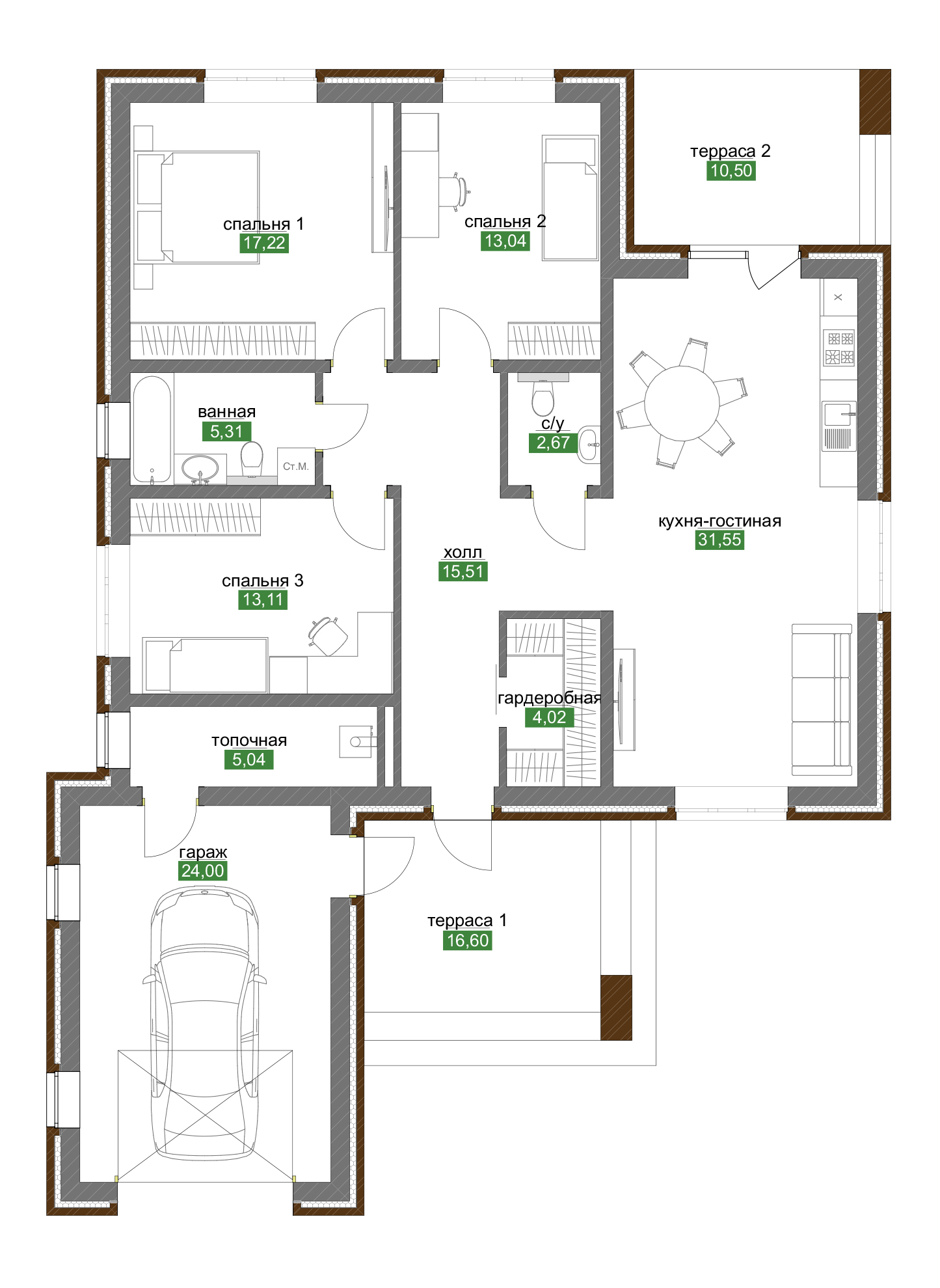 Три уютные спальни создают личное пространство для каждого члена семьи, а удобный холл объединяет все помещения в единую гармоничную композицию. Особое внимание уделено функциональности: здесь есть практичная ванная комната, компактный санузел, гараж для автомобиля и топочная для инженерных систем.