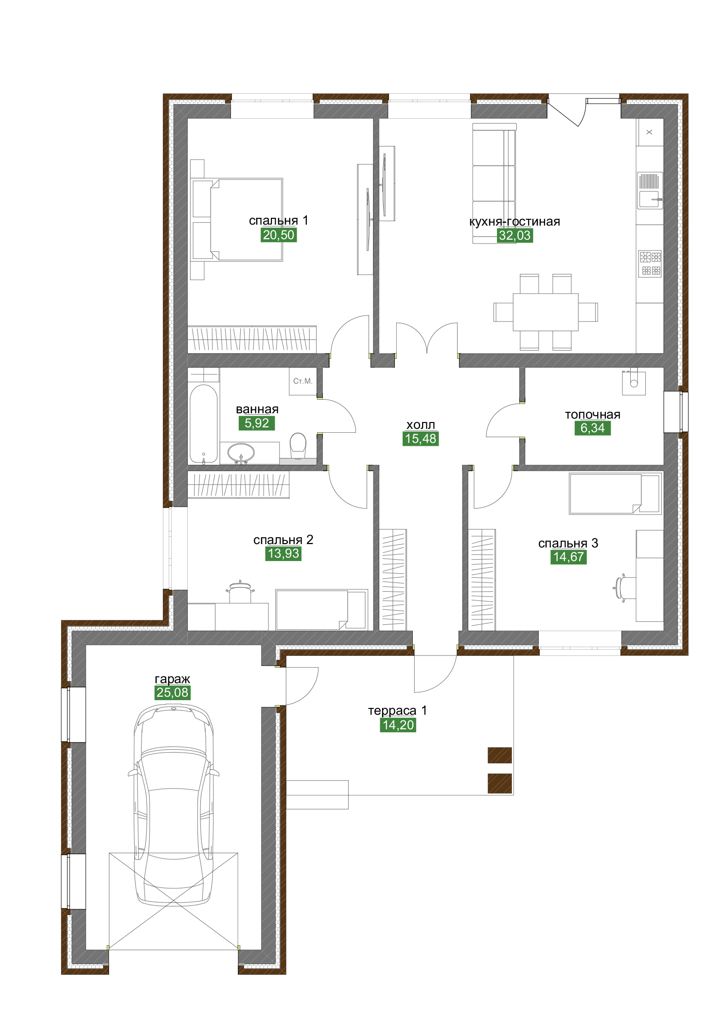 Три спальни практически равной площади обеспечивают комфортное размещение всех членов семьи. Планировка позволяет гибко использовать помещения как для детей разного возраста, так и для организации кабинета или гостевой комнаты по необходимости. В доме предусмотрена удобная ванная комната с современной планировкой и просторный холл, обеспечивающий комфортное перемещение между всеми зонами дома и создающий функциональную входную область. Встроенный гараж обеспечивает круглогодичную защиту автомобиля и удобство парковки в любую погоду. Топочная позволяет разместить инженерное оборудование для автономного отопления и может использоваться как техническое помещение. Терраса создает дополнительное пространство для отдыха на свежем воздухе и проведения семейных мероприятий. Продуманная планировка с центральным холлом обеспечивает рациональное использование каждого квадратного метра и удобные маршруты перемещения по дому.