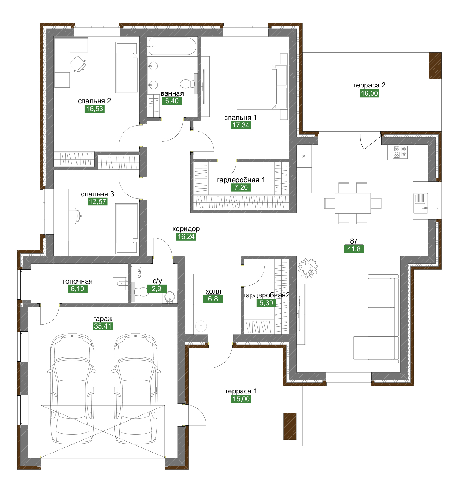 Особенностью проекта стал вместительный гараж на две машины — больше не нужно переживать о парковке или хранить автомобили под открытым небом. Дополнительные хозяйственные помещения и кладовые помогают поддерживать идеальный порядок.